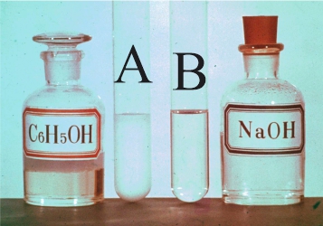 En el montaje de la figura se disponen un tubo de ensayo A, 30mL de fenol (que es incoloro y algo insoluble en agua) y se le agregan unas 10 mL de NaOH 2M. Reaccionan y su solubilidad aumenta como se visualiza en B.