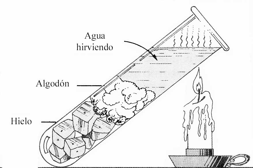 87*. En el experimento de la figura, observas que el hielo se mantiene sin fundirse junto al agua hirviendo, con solo la separación de un poco de algodón. Esto se debe a que: