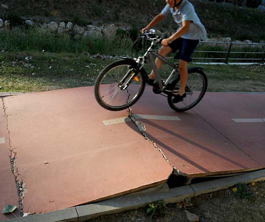 166. Como se aprecia en la foto la plancha de material por la que circula el ciclista, se ha dilatado mas que su soporte, y a consecuencia de este efecto ha perdido la horizontalidad, para evitar esto en la estructura con mezcla de materiales se hacen: