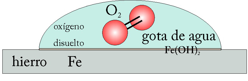 79. En el esquema dado, se representa la acción de una gota de agua sobre una plancha de hierro, que le va a producir corrosión, con la formación de hidróxido de hierro(II). Según lo dado y si ajustas el proceso por el procedimiento ion- electrón podrás asegurar que:
