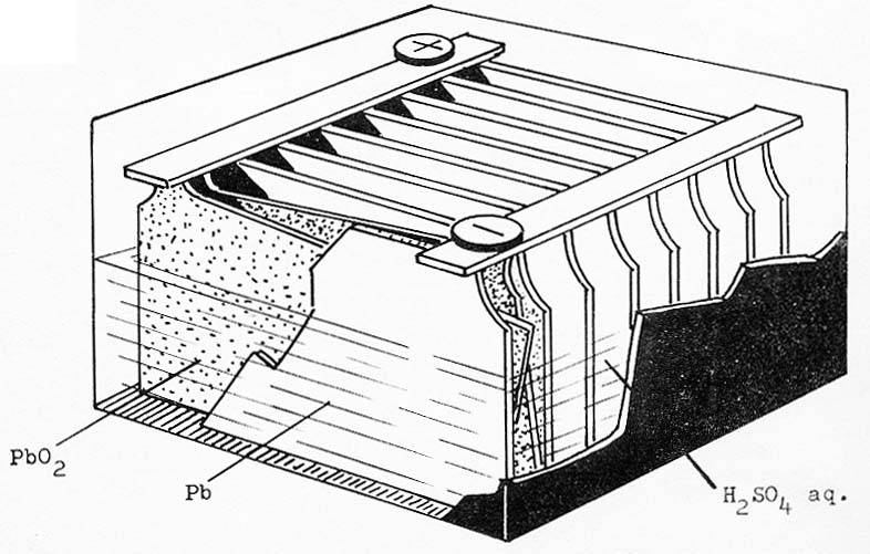 197. Una batería de coche, dada en la figura, pesa bastante y tiene la peculiaridad que es recargable, o sea es una batería secundaria, ya que puede invertir el proceso de descarga con el movimiento del coche, aportando energía. Lo primero es lógico porque emplea electrodos de plomo y óxido de plomo(IV).Si los potenciales normales son Pb2+/Pb=-0,4 y PbO2/Pb2+=1,68V.)Dirás que: