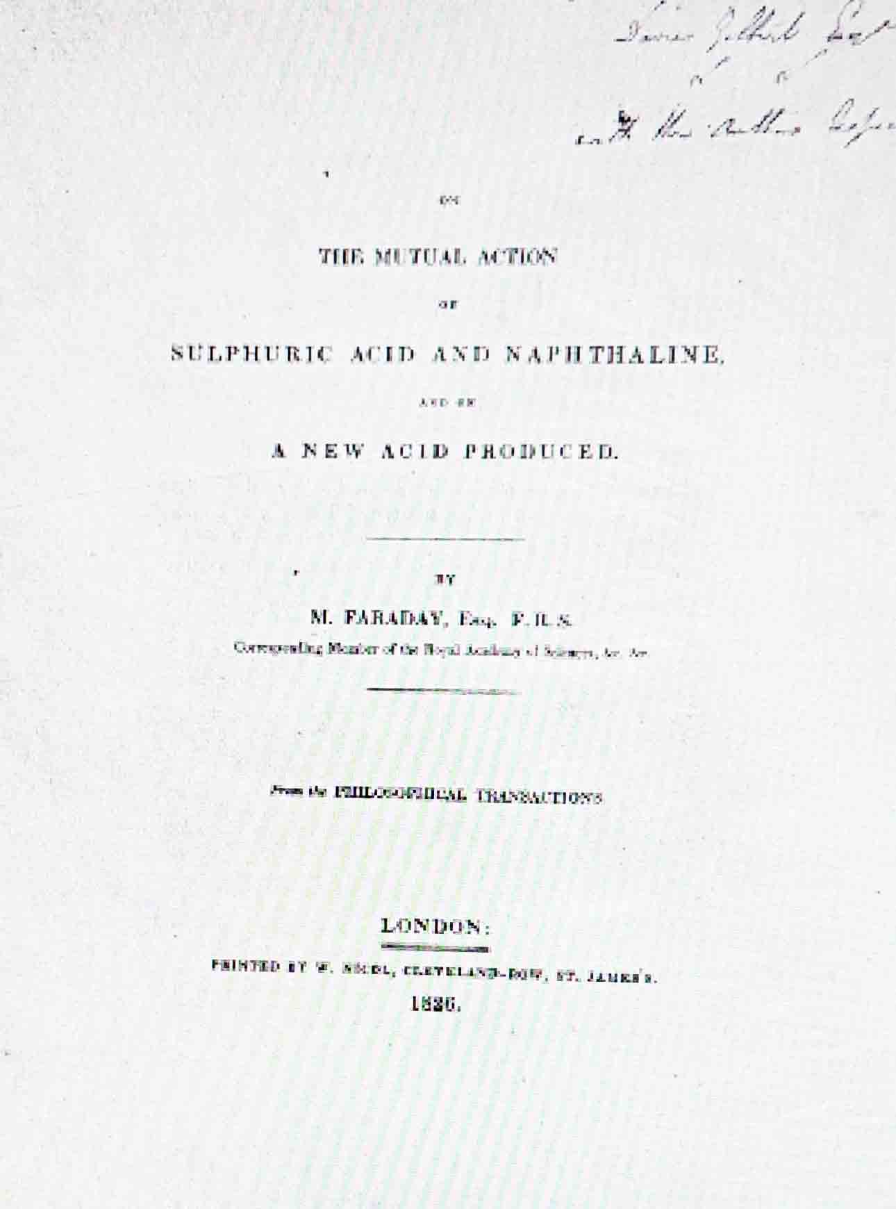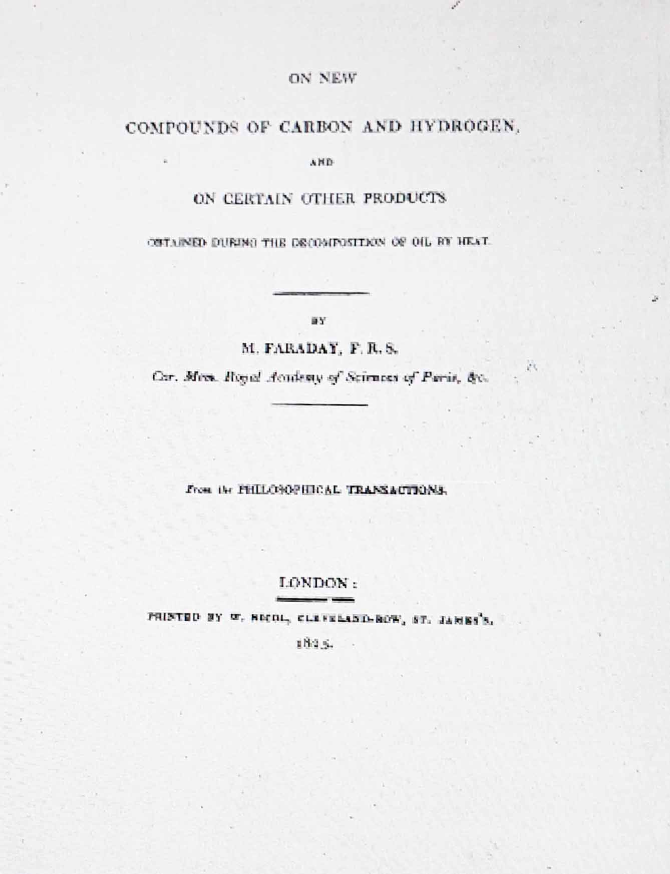 El 16 de junio de 1825, presentó en la Royal Society , el descubrimiento del benceno, butileno p-diclorobenceno y nitrobenceno (originalmente no fueron llamados así), en la destilación fraccionada de un subproducto sacado de la