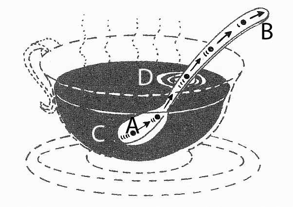 98*. En el dibujo se muestra una cucharilla metálica, sumergida en una taza de café con leche recién calentada, y antes de agitar con dicha cucharilla. De esta situación puede decir que desde: