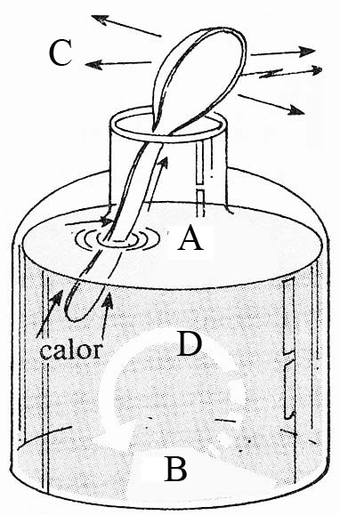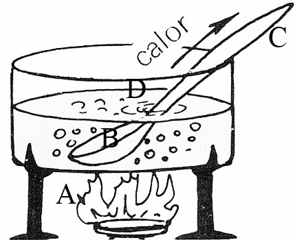 110. En el dibujo de la figura, se calienta un recipiente con agua, en donde se introduce una cuchara metálica. Dados los puntos A, B, C y D, podrás decir que el calor se propaga: